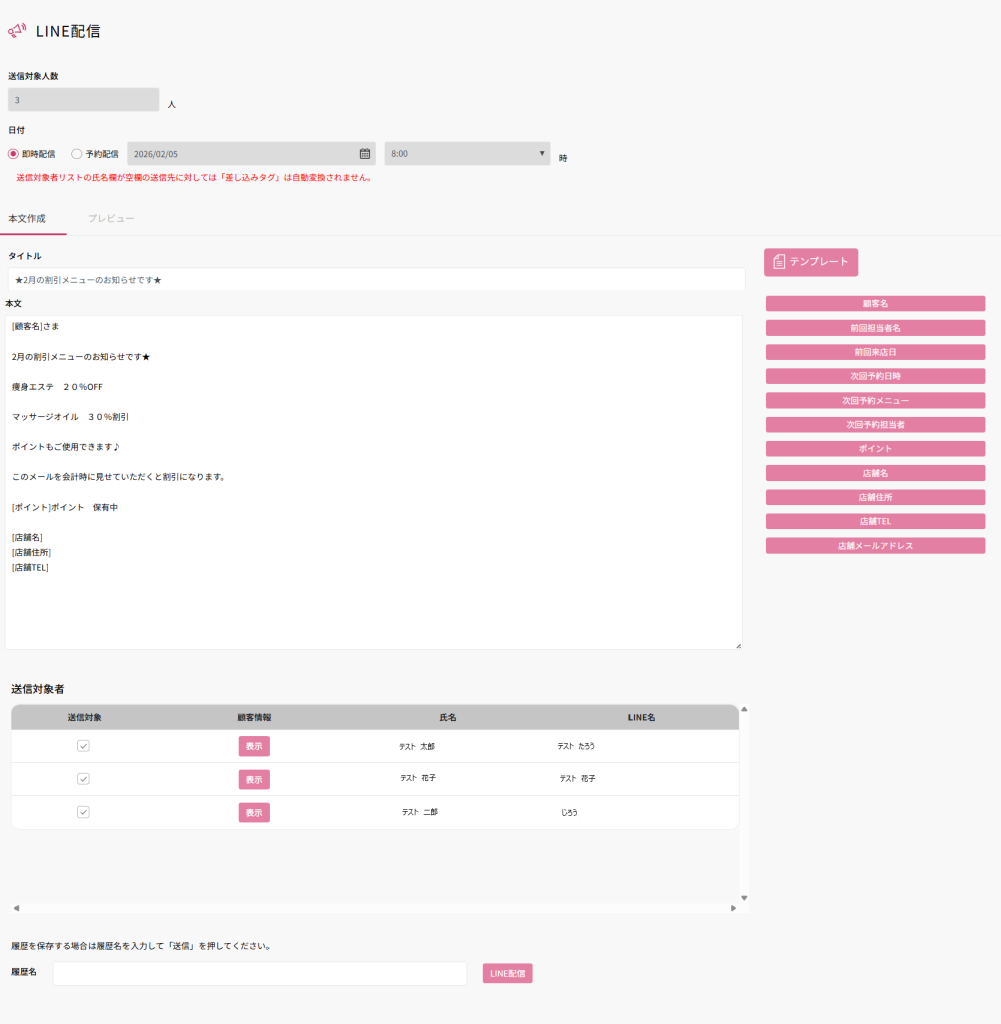 ② [LINE配信]ボタンをクリックすると、LINE配信画面が開きLINE作成をすることができます。