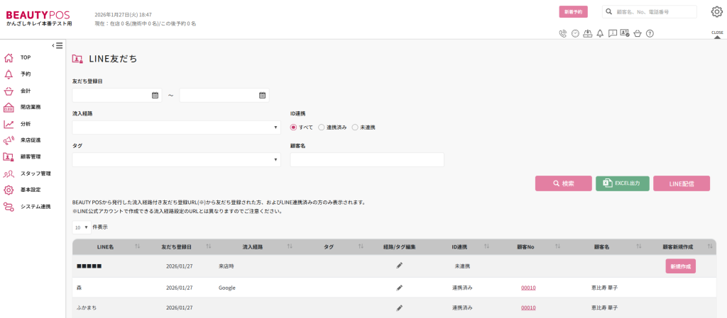 ●ビューティポスで作成した流入経路URL(友だち登録URL)から、LINE友だちの登録が完了すると、ポス側の「LINE友だち」画面に表示されます。