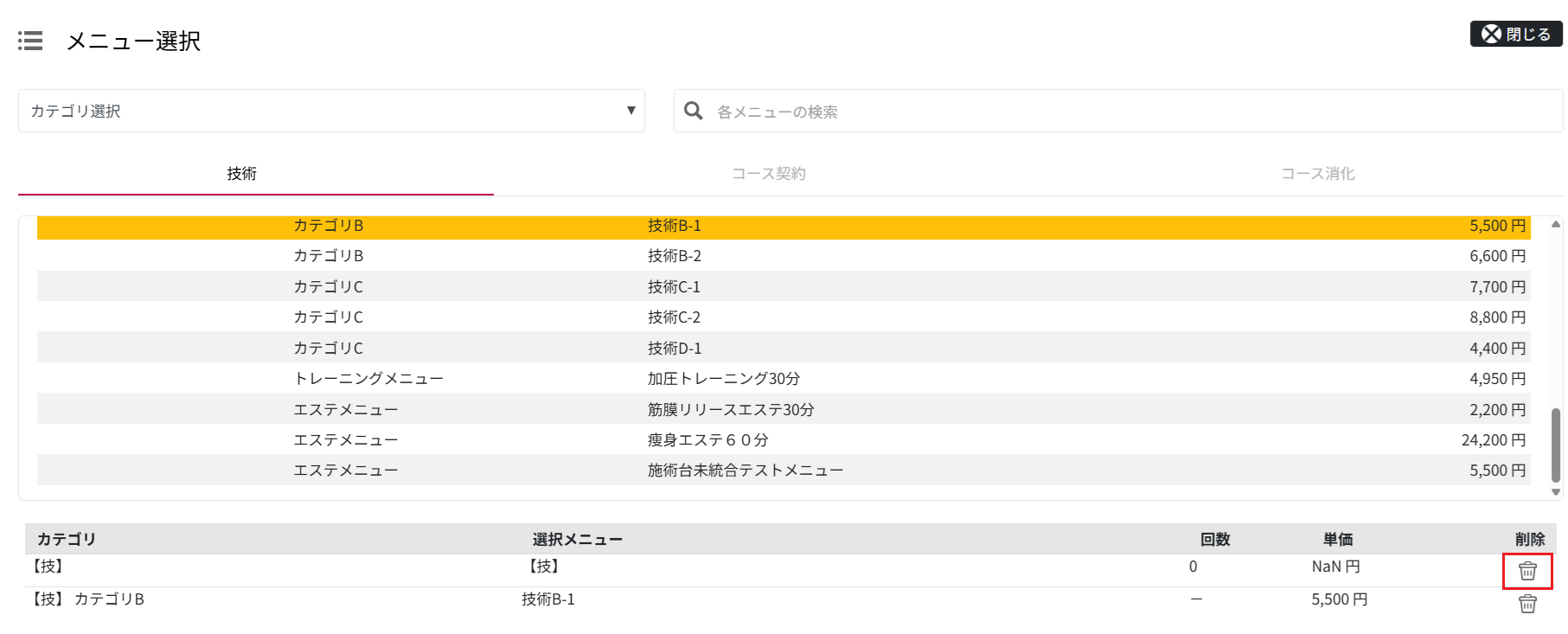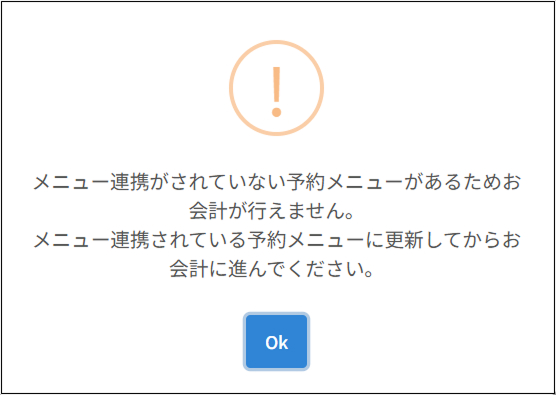 アラート2:メニュー連携がされていない予約メニューがあるためお会計が行えません。メニュー連携されている予約メニューに更新してからお会計に進んでください。