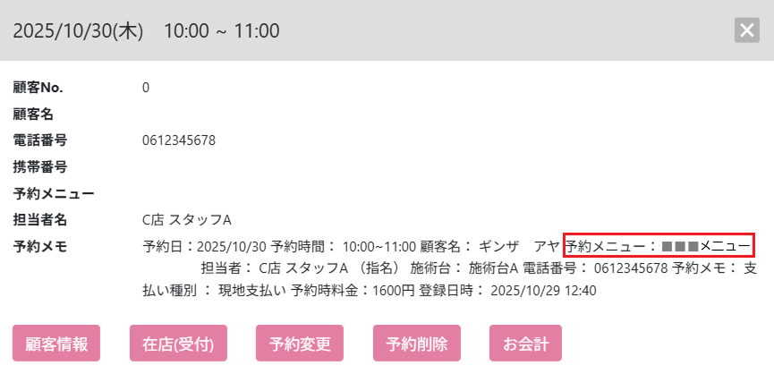 解決策:予約メモの内容を確認して、メニュー選択欄から正しいメニューを選択し、変更してください。