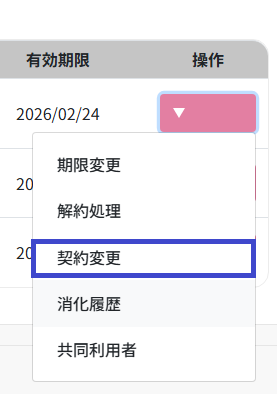 5.確認したいコース契約の右端にある「操作」の下にある②プルダウンをクリックし「契約変更」を選択します。