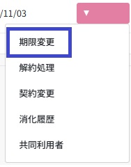 5.確認したいコース契約の右端にある「操作」の下にある②プルダウンメニューをクリックし「期限変更」を選択します。