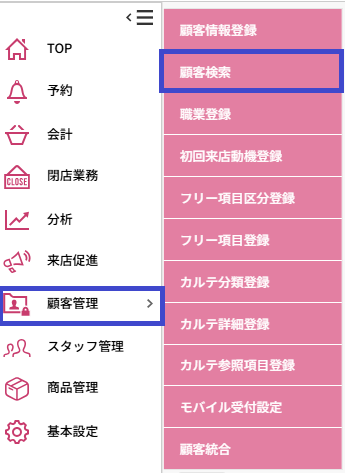 1.サイドバーの「顧客管理」をクリックし、「顧客検索」を選択します。