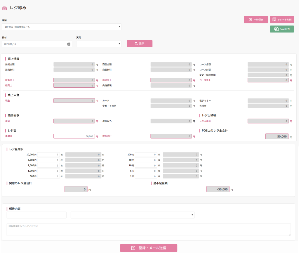 | [登録・メール送信]ボタン | レジ締め内容を登録し、関係者にメール送信します |