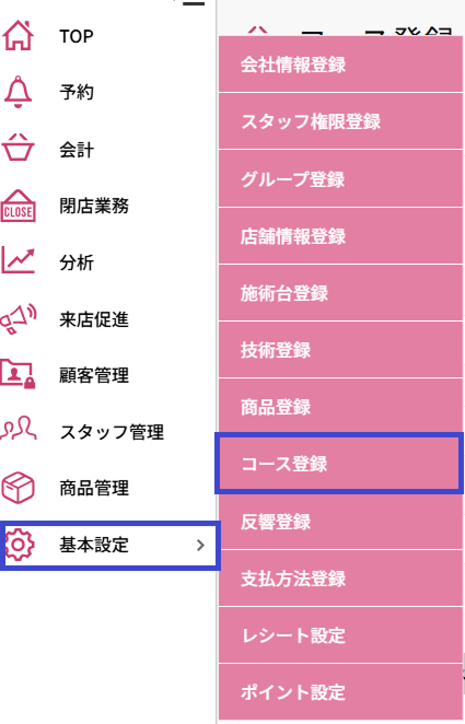 - 表示されるサブメニューの中から 「コース登録」 をクリックします。