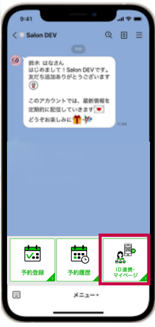 ① LINE友だちになった顧客側のLINE画面の下部リッチメニュー内の[ID連携・マイページ]をタップします。