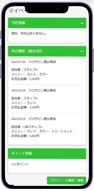 ② ID連携が完了していると、マイページが表示されます。次回予約情報・過去の来店履歴・ポイント情報がご確認いただけます。
