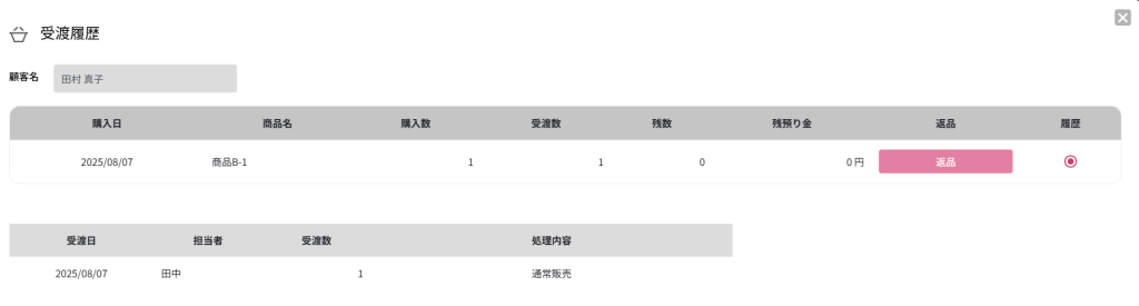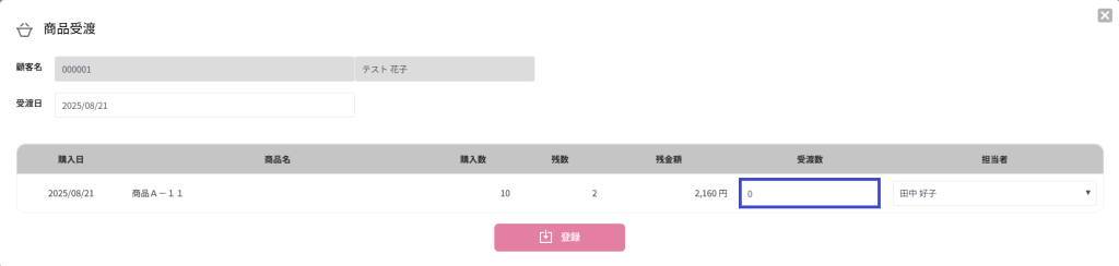 | 受渡数 | 実際に受け渡した商品の数量(自動表示) |