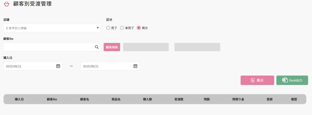 | 区分 | 受渡状況の絞り込み(完了・未完了・両方から選択) |