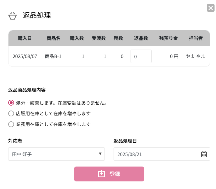 | 返品商品処理内容 | 返品後の商品処理方法を選択 |