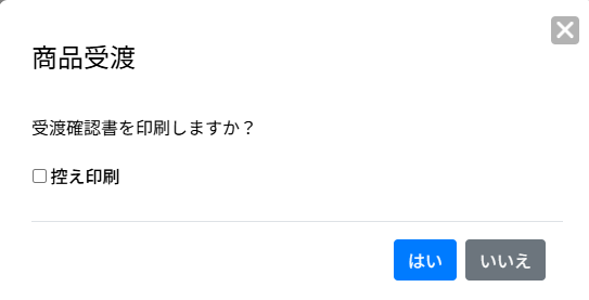 7.「商品受渡」の確認メッセージ画面が表示されます。控え印刷の有無をチェックし、[はい]か[いいえ]をクリックして完了です。