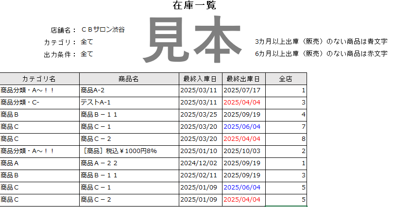 - 青文字の日付:3ヶ月以上出庫がない商品(在庫管理注意)