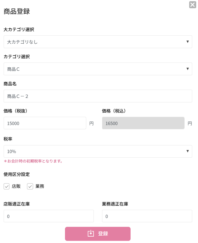 店頭で販売している商品だけでなく、業務用で消費する商品も登録可能です。