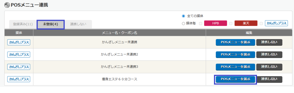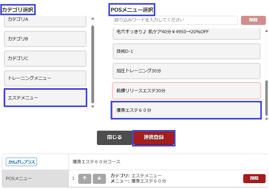 2.登録が完了したら、かんざし、または、かんざしキレイサロンでPOSメニュー連携を行います。