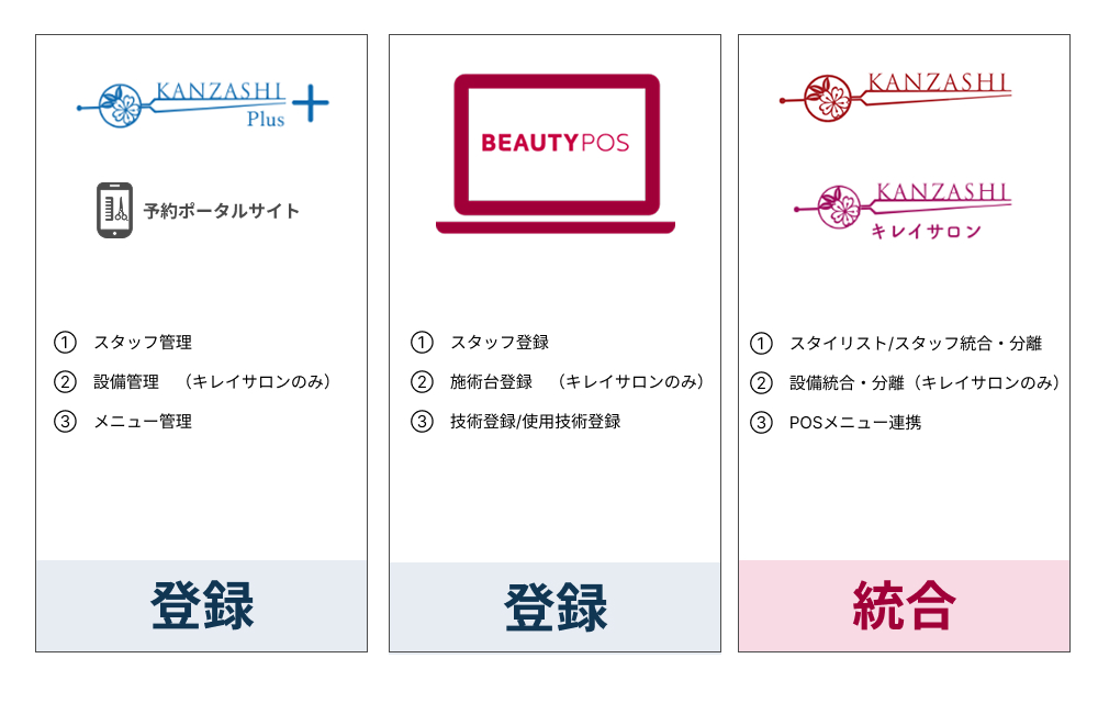 事前にかんざしプラス、ビューティーポスともに登録を行い、かんざしにて統合を行わなければかんざしに連携されませんので、必ず登録と統合の作業を行ってください。
