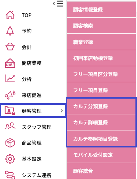 2.「カルテ分類登録」「カルテ詳細登録」「カルテ参照項目登録」を開きます。