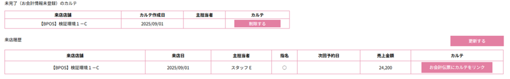 5.お会計伝票とカルテをリンクさせたい顧客の顧客情報ページが表示され、来店履歴一覧の表の右端にある[お会計伝票にカルテをリンク]ボタンをクリックすると、「お会計伝票とリンクしました」というメッセージがでたら完了です。
