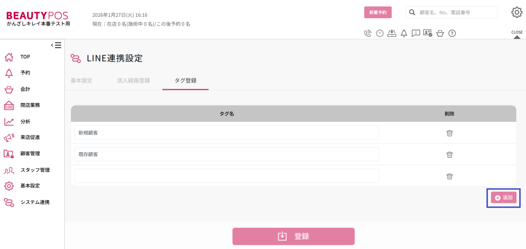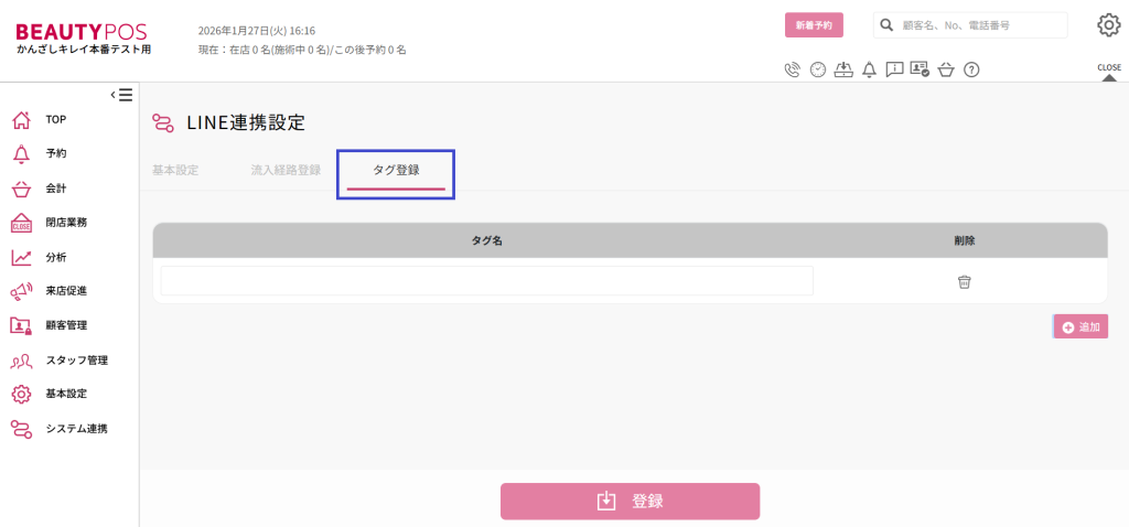 ① LINE連携設定画面の「タグ登録」タブをクリックします。