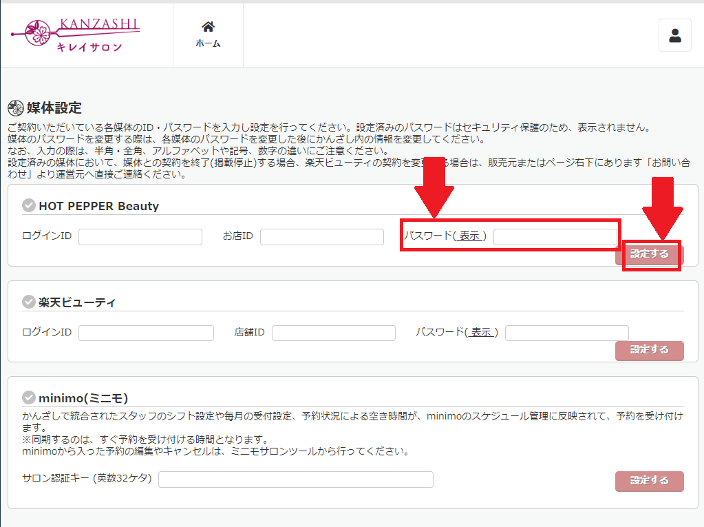 ■ 該当の媒体「パスワード」欄に入力して頂き、「設定する」ボタンを押してください。