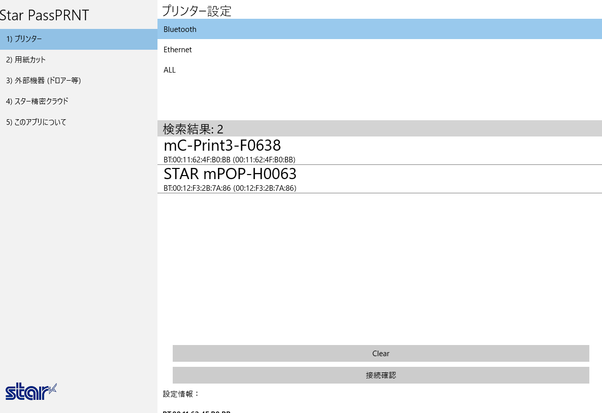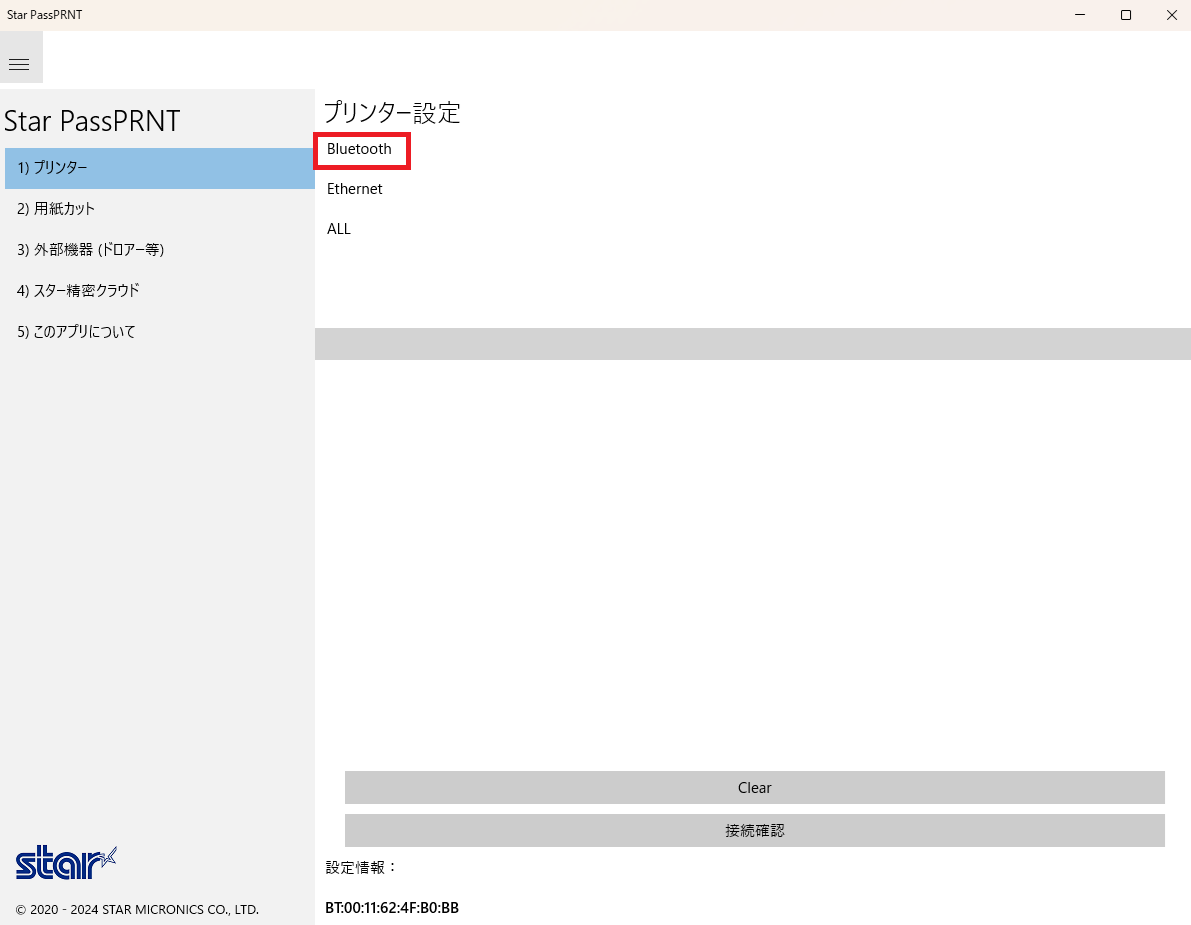 1.「Star PassPRNT」のアプリを開き、「Bluetooth」をクリックします。