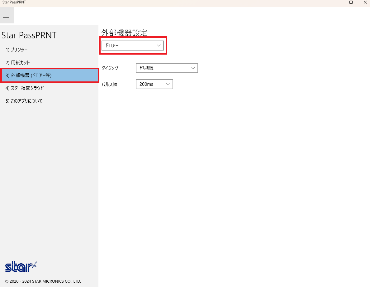 レシート出力時にドロアを開きたい場合は、PassPRNTの「外部接続」メニューをひらき、ドロアーの選択をしてください。
