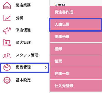 - 表示されるサブメニューの中から 「入庫伝票」または、「出庫伝票」 をクリックします。