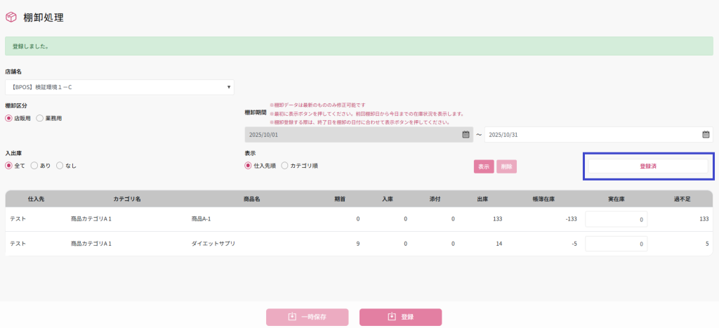 ④ 処理が完了すると、[登録済]に表示が変わり棚卸処理が完了します。