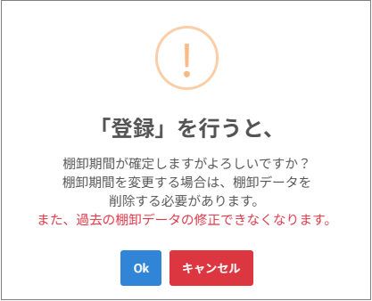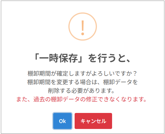 「保存」「一時保存」をおこなうと、棚卸期間が確定します。確定した期間を変更する場合は、棚卸データ自体を削除する必要があります。