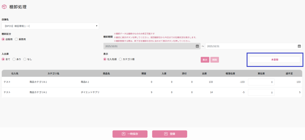 ●「未登録」ボタン表示・・・棚卸処理が未処理