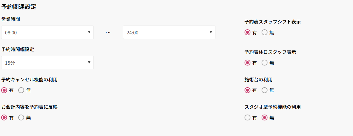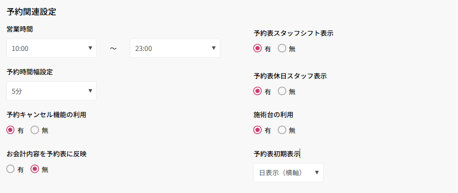 | 予約表スタッフシフト表示 | 予約表に出勤しているスタッフを表示する有無を設定します。 |