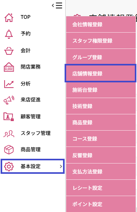 - 表示されたメニューから「店舗情報登録」を選択します。