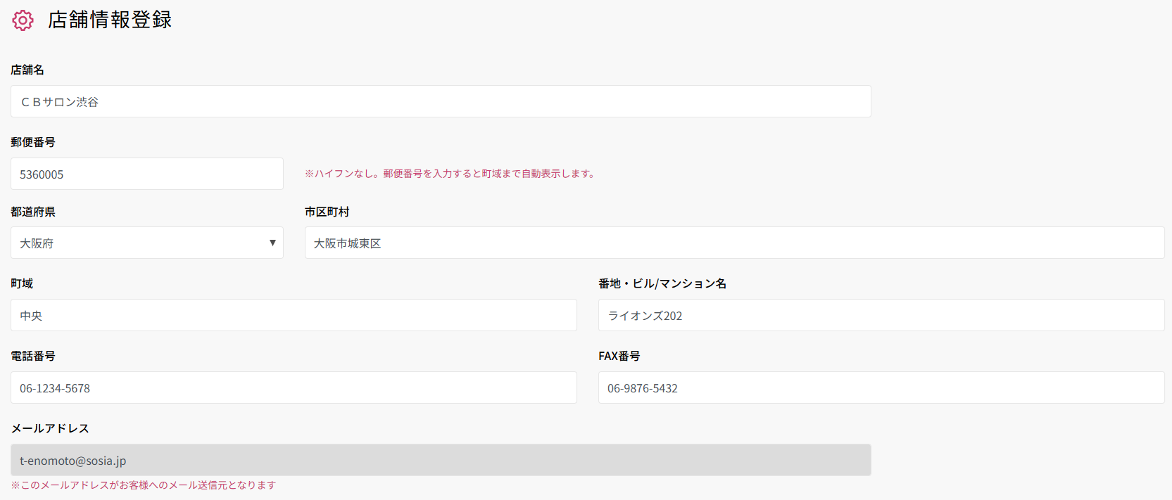 | メールアドレス | 各種メール送信時の送信元となりますが、店舗側で入力できません。 ★納品時、システム側で設定させて頂いております。原則、変更はできません。 |