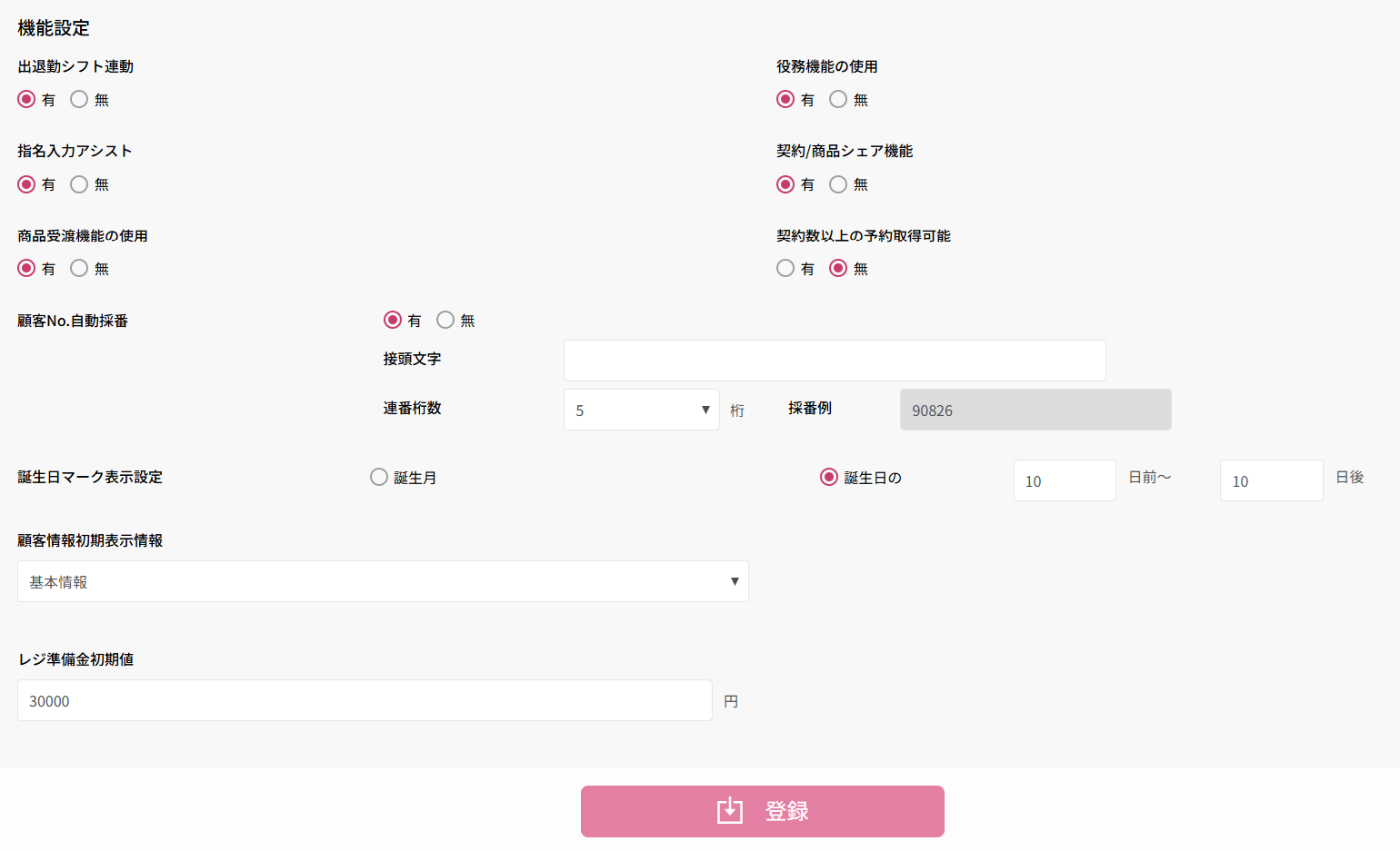 | 誕生日マーク表示設定 | 誕生日のお客様をマークで表示する設定です。「誕生月」または「誕生日の○日前~○日後」から選択 |