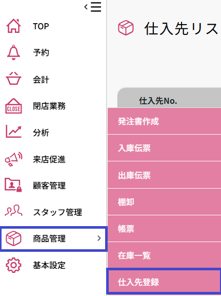 - 表示されるサブメニューの中から 「仕入先登録」 をクリックします。