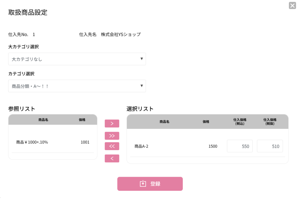 ※「商品登録されているため、削除でいません。」とメッセージが出た場合は、選択リストから商品をすべて参照リストに移動したのち削除作業を行ってください。