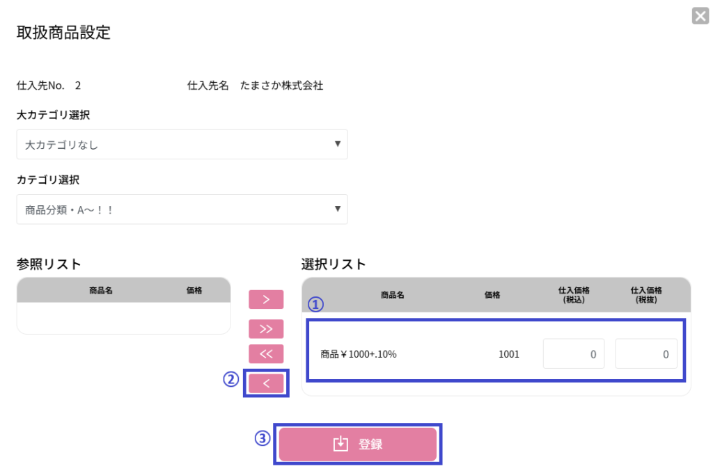 ② 選択した商品を[<]をクリックして参照リストに移動させます